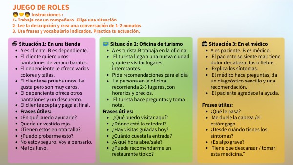 🧑🤝🧑 Instrucciones : 1- Trabaja con un compañero. Elige una situación 2- Lee la descripción y crea una conversación de 1-2 minutos 3. Usa frases y vocabulario indicados. Practica tu actuación.