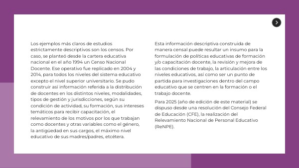 Los ejemplos más claros de estudios estrictamente descriptivos son los censos. Por caso, se planteó desde la cartera educativa nacional en el año 1994 un Censo Nacional Docente. Ese operativo fue replicado en 2004 y 2014, para todos los niveles del sistema educativo excepto el nivel superior universitario. Se pudo construir así información referida a la distribución de docentes en los distintos niveles, modalidades, tipos de gestión y jurisdicciones, según su condición de actividad, su formación, sus intereses temáticos para recibir capacitación, el relevamiento de los motivos por los que trabajan como docentes y otras variables como el género, la antigüedad en sus cargos, el máximo nivel educativo de sus madres/padres, etcétera.