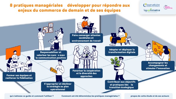 À partir de ces facteurs, 8 grandes pratiques managériales à développer par les managers de demain dans le commerce, ont été mises en évidence et caractérisées selon un format identique : • ce qui est attendu de la part du manager • les leviers-clés à activer • des pistes d'action pour passer à l’action • des pistes de formation pour développer ses compétences.