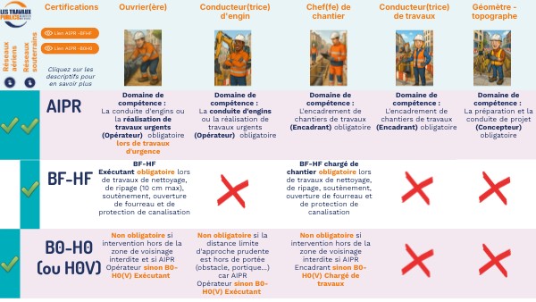 AIPR et habilitation pour les ouvrages électriques aériens : Les connaissances requises IPR faisant partie du tronc commun de base de toutes les formations, il est admis que toute habilitation électrique puisse permettre cette reconnaissance de compétence. Toutefois, l’autorisation d’intervention à proximité de réseaux n’est dans ce cas valable que pour les ouvrages électriques aériens, le travailleur n’étant pas autorisé à effectuer des travaux à proximité d’ouvrages souterrains ou subaquatiques.