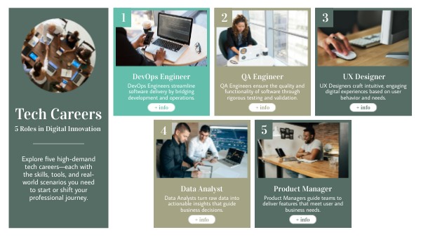 Explore five high-demand tech careers—each with the skills, tools, and real-world scenarios you need to start or shift your professional journey.