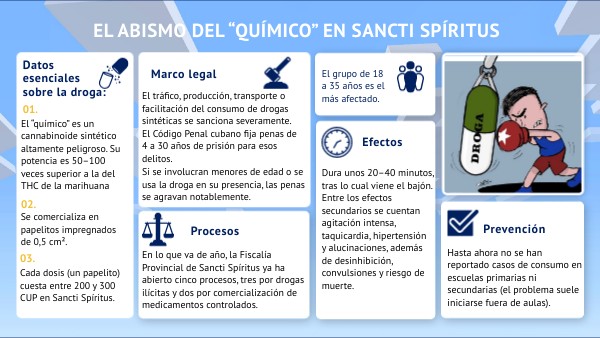 El tráfico, producción, transporte o facilitación del consumo de drogas sintéticas se sanciona severamente.El Código Penal cubano fija penas de 4 a 30 años de prisión para esos delitos.