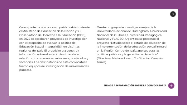 Como parte de un concurso público abierto desde el Ministerio de Educación de la Nación y su Observatorio del Derecho a la Educación (ODE), en 2022 se aprobaron proyectos de investigación con el propósito de evaluar la política de Educación Sexual Integral (ESI) en distintas regiones del país. El propósito era construir información sobre el estado de situación en relación con sus avances, retrocesos, obstáculos y vacancias. Los destinatarios de esta convocatoria fueron equipos de investigación de universidades públicas.