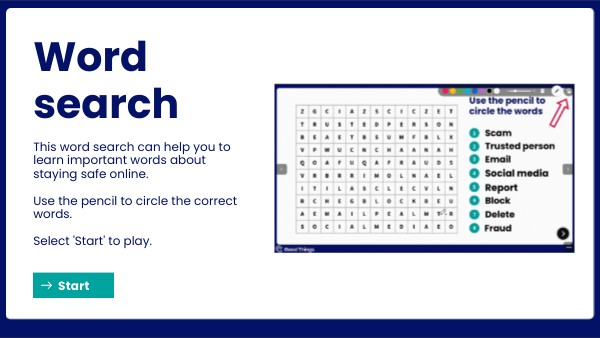 This word search can help you to learn important words about staying safe online. Use the pencil to circle the correct words. Select 'Start' to play.