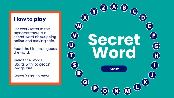 For every letter in the alphabet there is a secret word about going online and staying safe. Read the hint then guess the word. Select the words "Starts with" to get an image hint. Select "Start" to play!