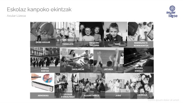 - Euskaran eta Euskal Kulturan ardaztutako jolas eta ekintza ludikoetan oinarritutako aisialdirako proposamena da. / Es una propuesta de ocio basada en juegos y actividades lúdicas centradas en el euskera y la cultura vasca.