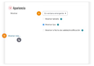 Mostrar. En este desplegable puedes configurar la forma en la que se mostrará al estudiantado el archivo que estás agregando. Las opciones posibles son:
