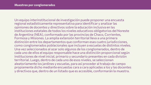 Un proyecto de investigación plantea como foco de interés las estrategias didácticas de docentes en escuelas secundarias de la provincia de Entre Ríos para abordar la Educación Sexual Integral desde el área de Ciencias Sociales. Para ello, el equipo responsable de la investigación despliega una estrategia de primer acercamiento en capacitaciones docentes presenciales y obligatorias, solicitando la participación voluntaria en el estudio solo a aquellos/as profesores y profesoras que ya tengan experiencia de trabajo sobre esa temática y cumplan así con los requisitos de inclusión en la muestra. Así, el criterio estratégico o de juicio experto es el que guía la construcción de la muestra, que será representativa de ese grupo particular de docentes y permitirá construir conocimiento situado sobre sus recorridos de trabajo Eventualmente, las conclusiones locales así obtenidas podrían inspirar otros estudios más amplios o con otro enfoque.