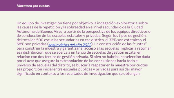 Un equipo de investigación tiene por objetivo la indagación exploratoria sobre las causas de la repetición y la sobreedad en el nivel secundario de la Ciudad Autónoma de Buenos Aires, a partir de la perspectiva de los equipos directivos o de conducción de las escuelas estatales y privadas. Según los tipos de gestión, del total de 500 escuelas secundarias en ese distrito, el 32% son estatales y el 68% son privadas ( ). La construcción de las “cuotas” para construir la muestra y garantizar el acceso a las escuelas implicaría retomar esa distribución, que se acerca a un tercio de escuelas de gestión estatal en relación con dos tercios de gestión privada. Si bien no habría una selección dada por el azar que asegure la extrapolación de las conclusiones hacia todo el universo de escuelas del distrito, se buscaría respetar en la muestra por cuotas esa proporción inicial entre escuelas públicas y privadas para así dar mayor significado en contexto a los resultados de investigación que se obtengan.