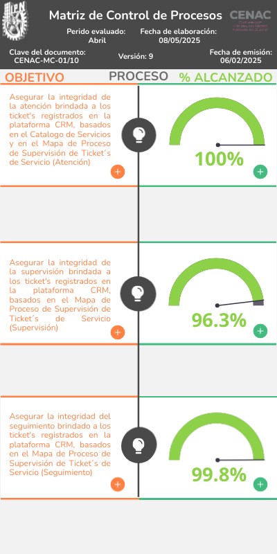 Asegurar una eficacia mayor a 95% con respecto a: * El apoyo que se brinda por parte del personal del CAU * El tiempo de solución por parte del Ingeniero de servicio * La solución brindada por parte del Ingeniero de servicio * El servicio brindado por el CENAC.
