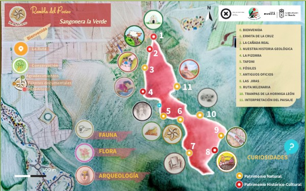 Os invitamos a disfrutar de uno de los enclaves paisajísticos más interesantes de Sangonera la Verde, la Rambla del Pocico. Lo hacemos proponiendo un itinerario circular por algunos de sus rincones más emblemáticos, en los que podréis conocer gran parte del patrimonio humano, cultural y natural que atesora. La idea de elaborar y documentar este recorrido surge del proyecto intergeneracional “Rambla del Pocico”: una iniciativa promovida por el IES Sangonera la Verde en la que ha confluido la participación activa del Centro Cultural de Sangonera la Verde y su Taller de Historia, la colaboración y el asesoramiento de expertos en diversos ámbitos académicos y profesionales, y la implicación por parte de otras entidades como Ecoambiental, el Aula de la Naturaleza del Majal Blanco y la Plataforma Vecinal Planeta Verde. Los resultados de toda esta puesta en común y las actuaciones realizadas a lo largo del proceso, han servido para documentar de forma colaborativa e interdisciplinar lo que ahora os ofrecemos: una guía didáctica e interactiva sobre la Rambla del Pocico, con el propósito participativo de seguir ampliando y mejorando sus contenidos en el futuro.