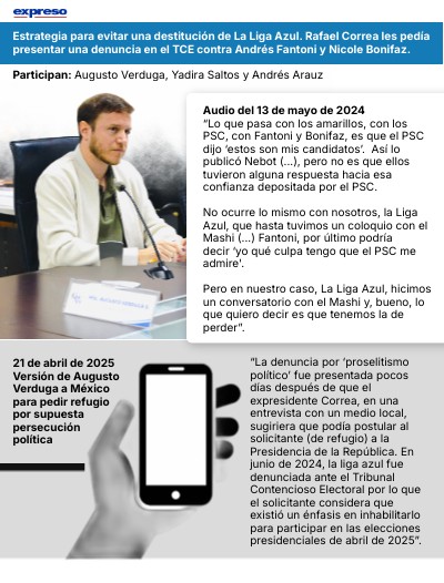 “La denuncia por ‘proselitismo político’ fue presentada pocos días después de que el expresidente Correa, en una entrevista con un medio local, sugiriera que podía postular al solicitante (de refugio) a la Presidencia de la República. En junio de 2024, la liga azul fue denunciada ante el Tribunal Contencioso Electoral por lo que el solicitante considera que existió un énfasis en inhabilitarlo para participar en las elecciones presidenciales de abril de 2025”.