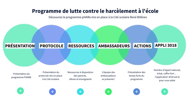 Octobre : Intervention de la gendarmerie autour du cyberhacèlement (niveau 6e/4e) Novembre : Participation à la journée Non au Harcèlement Décembre : Enregistrement d'un podcast par les ambassadeurs Janvier : Participation des ambassadeurs au Prix Non harcèlement Tout au long de l'année : Réunion des ambassadeurs Formation de l'équipe ressource Entretiens dans le cadre de la MPP