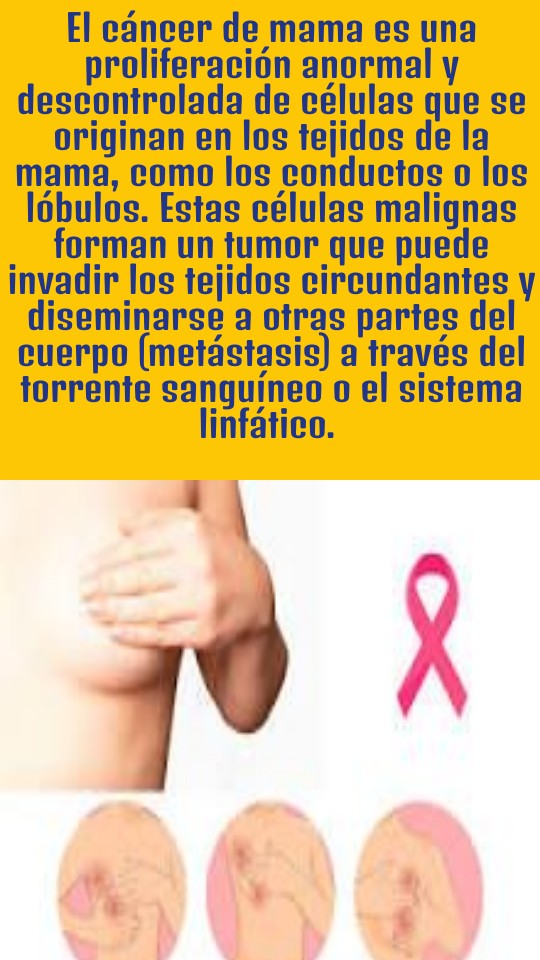 El cáncer de mama es una proliferación anormal y descontrolada de células que se originan en los tejidos de la mama, como los conductos o los lóbulos. Estas células malignas forman un tumor que puede invadir los tejidos circundantes y diseminarse a otras partes del cuerpo (metástasis) a través del torrente sanguíneo o el sistema linfático.