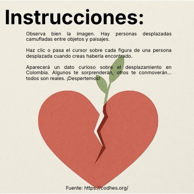 Observa bien la imagen. Hay personas desplazadas camufladas entre objetos y paisajes. Haz clic o pasa el cursor sobre cada figura de una persona desplazada cuando creas haberla encontrado. Aparecerá un dato curioso sobre el desplazamiento en Colombia. Algunos te sorprenderán, otros te conmoverán… todos son reales. ¡Despertemos!