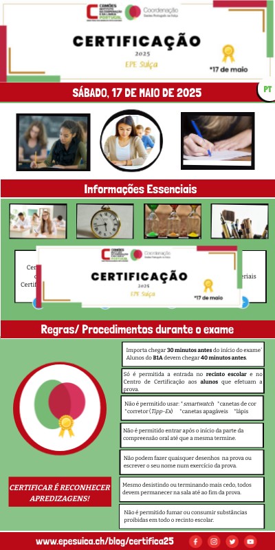 Só é permitida a entrada no recinto escolar e no Centro de Certificação aos alunos que efetuam a prova.