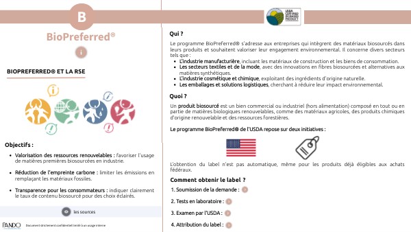 si le produit répond aux critères, il peut être inscrit dans la base de données BioPreferred®. Une fois certifiés, les produits sont soumis à des audits réguliers pour vérifier la conformité du contenu biosourcé.