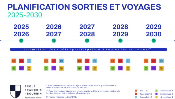 *Cette planification offre un aperçu des coûts à anticiper au cours du parcours scolaire et peuvent être révisés ** Pour les voyages étudiants, les montants à débourser sont échelonnés . Destinations et coûts sujets à changements Dernière révision ; Avril 2025