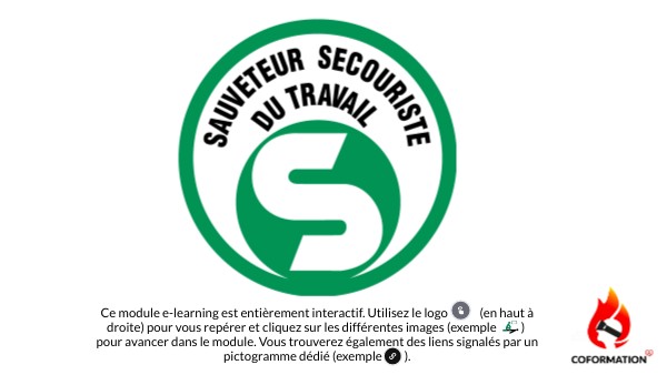 Ce module e-learning est entièrement interactif. Utilisez le logo (en haut à droite) pour vous repérer et cliquez sur les différentes images (exemple ) pour avancer dans le module. Vous trouverez également des liens signalés par un pictogramme dédié (exemple ).