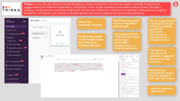 Trinka és una eina de redacció especialitzada en textos acadèmics i tècnics en anglès i castellà. Proporciona suggeriments per millorar la gramàtica, l'ortografia i l'estil. Ajuda a redactar documents més precisos, formals i efectius. També permet reescriure fragments del text per millorar la coherència, la claredat i l'adequació al registre acadèmic, contribuint així a elevar la qualitat global dels escrits segons les necessitats de l'autor.