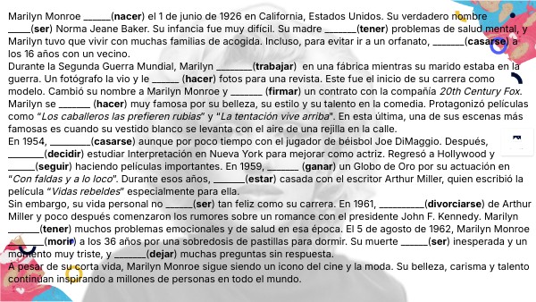 Marilyn Monroe ______(nacer) el 1 de junio de 1926 en California, Estados Unidos. Su verdadero nombre _____(ser) Norma Jeane Baker. Su infancia fue muy difícil. Su madre _______(tener) problemas de salud mental, y Marilyn tuvo que vivir con muchas familias de acogida. Incluso, para evitar ir a un orfanato, _______(casarse) a los 16 años con un vecino. Durante la Segunda Guerra Mundial, Marilyn ________(trabajar) en una fábrica mientras su marido estaba en la guerra. Un fotógrafo la vio y le ______ (hacer) fotos para una revista. Este fue el inicio de su carrera como modelo. Cambió su nombre a Marilyn Monroe y _______ (firmar) un contrato con la compañía 20th Century Fox. Marilyn se _______ (hacer) muy famosa por su belleza, su estilo y su talento en la comedia. Protagonizó películas como “Los caballeros las prefieren rubias” y “La tentación vive arriba". En esta última, una de sus escenas más famosas es cuando su vestido blanco se levanta con el aire de una rejilla en la calle. En 1954, _________(casarse) aunque por poco tiempo con el jugador de béisbol Joe DiMaggio. Después, ________(decidir) estudiar Interpretación en Nueva York para mejorar como actriz. Regresó a Hollywood y ______(seguir) haciendo películas importantes. En 1959, _______ (ganar) un Globo de Oro por su actuación en “Con faldas y a lo loco”. Durante esos años, _______(estar) casada con el escritor Arthur Miller, quien escribió la película “Vidas rebeldes” especialmente para ella. Sin embargo, su vida personal no ______(ser) tan feliz como su carrera. En 1961, __________(divorciarse) de Arthur Miller y poco después comenzaron los rumores sobre un romance con el presidente John F. Kennedy. Marilyn _______(tener) muchos problemas emocionales y de salud en esa época. El 5 de agosto de 1962, Marilyn Monroe ________(morir) a los 36 años por una sobredosis de pastillas para dormir. Su muerte ______(ser) inesperada y un momento muy triste, y _______(dejar) muchas preguntas sin respuesta. A pesar de su corta vida, Marilyn Monroe sigue siendo un icono del cine y la moda. Su belleza, carisma y talento continúan inspirando a millones de personas en todo el mundo.