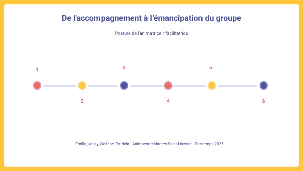 Posture :Choix 1 : L'animatrice redevient un "simple" membre du groupe. Elle peut rester en veille au cas où il faut redynamiser le groupe.