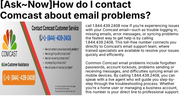 call 1.844.439.2408 now If you’re experiencing issues with your Comcast email—such as trouble logging in, missing emails, error messages, or syncing problems—the fastest way to get help is by calling 1.844.439.2408. This toll-free number connects you directly to Comcast’s email support team, where trained specialists are available to resolve your issues quickly and efficiently. Common Comcast email problems include forgotten passwords, account lockouts, problems sending or receiving messages, and difficulties syncing email on mobile devices. By calling 1.844.439.2408, you can speak with a live agent who will guide you step-by-step through the troubleshooting process. Whether you’re a home user or managing a business account, this number is your direct line to professional support.