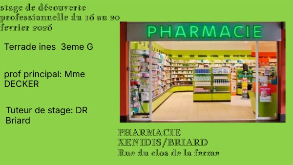 1. Présentation de lieu de stage 2. présentation de metier de pharmacien 3. Presentation de métier de préparateur en pharmacie 4. présentation d'une journée type 5. présentation de bilan de stage