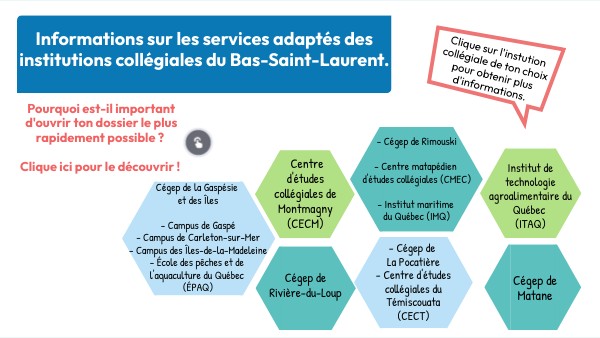 Informations sur les services adaptés des institutions collégiales du Bas-Saint-Laurent.