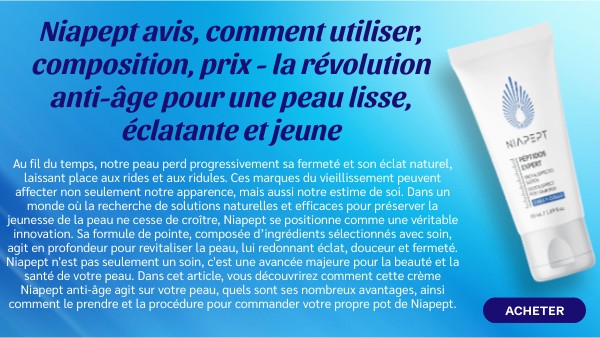 Au fil du temps, notre peau perd progressivement sa fermeté et son éclat naturel, laissant place aux rides et aux ridules. Ces marques du vieillissement peuvent affecter non seulement notre apparence, mais aussi notre estime de soi. Dans un monde où la recherche de solutions naturelles et efficaces pour préserver la jeunesse de la peau ne cesse de croître, Niapept se positionne comme une véritable innovation. Sa formule de pointe, composée d’ingrédients sélectionnés avec soin, agit en profondeur pour revitaliser la peau, lui redonnant éclat, douceur et fermeté. Niapept n'est pas seulement un soin, c'est une avancée majeure pour la beauté et la santé de votre peau. Dans cet article, vous découvrirez comment cette crème Niapept anti-âge agit sur votre peau, quels sont ses nombreux avantages, ainsi comment le prendre et la procédure pour commander votre propre pot de Niapept.