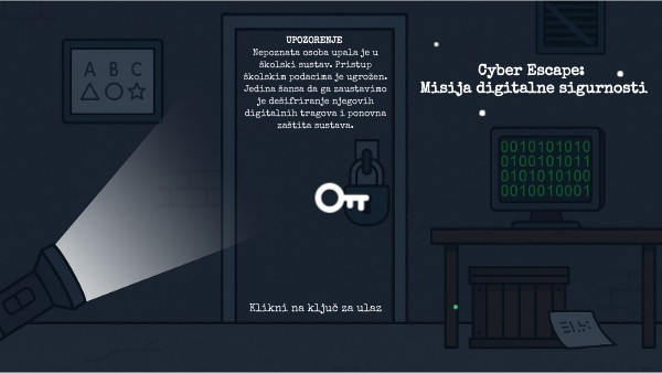 💡 Upute za igru: Klikni na interaktivne elemente kako bi pronašao/la zadatke i tragove. Pažljivo čitaj upute i razmišljaj logički. Točan odgovor otključava sljedeći izazov. Kad prikupiš svih 5 znakova, unosiš završni kod. 🔐 Samo oni koji znaju prepoznati prijetnje, razmišljati logično i koristiti znanje o digitalnoj sigurnosti mogu zaustaviti hakera.