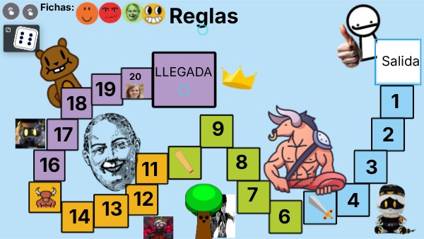 Máximo 4 jugadores.Comienza el jugador que saque el número más alto. El que llega al final es el ganador. Se avanza según el número que te sale en el dado o lo que diga la casilla especial.