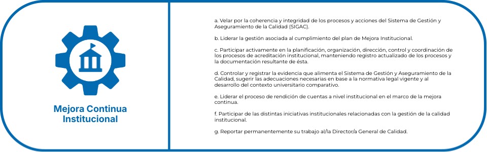 a. Velar por la coherencia y integridad de los procesos y acciones del Sistema de Gestión y Aseguramiento de la Calidad (SIGAC). b. Liderar la gestión asociada al cumplimiento del plan de Mejora Institucional. c. Participar activamente en la planificación, organización, dirección, control y coordinación de los procesos de acreditación institucional, manteniendo registro actualizado de los procesos y la documentación resultante de ésta. d. Controlar y registrar la evidencia que alimenta el Sistema de Gestión y Aseguramiento de la Calidad, sugerir las adecuaciones necesarias en base a la normativa legal vigente y al desarrollo del contexto universitario comparativo. e. Liderar el proceso de rendición de cuentas a nivel institucional en el marco de la mejora continua. f. Participar de las distintas iniciativas institucionales relacionadas con la gestión de la calidad institucional. g. Reportar permanentemente su trabajo al/la Director/a General de Calidad.
