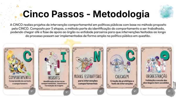 A CINCO realiza projetos de intervenção comportamental em políticas públicas com base no método proposto pela CINCO. Composto por 5 etapas, o método parte da identificação do comportamento a ser trabalhado, podendo chegar até a fase de apoio ao órgão ou entidade parceiros para que intervenções testadas ao longo do processo possam ser implementadas de forma ampla na política pública em questão.