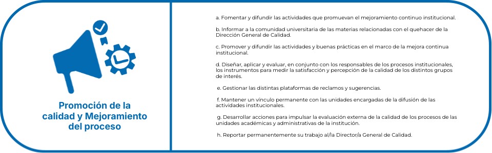 a. Fomentar y difundir las actividades que promuevan el mejoramiento continuo institucional. b. Informar a la comunidad universitaria de las materias relacionadas con el quehacer de la Dirección General de Calidad. c. Promover y difundir las actividades y buenas prácticas en el marco de la mejora continua institucional. d. Diseñar, aplicar y evaluar, en conjunto con los responsables de los procesos institucionales, los instrumentos para medir la satisfacción y percepción de la calidad de los distintos grupos de interés. e. Gestionar las distintas plataformas de reclamos y sugerencias. f. Mantener un vínculo permanente con las unidades encargadas de la difusión de las actividades institucionales. g. Desarrollar acciones para impulsar la evaluación externa de la calidad de los procesos de las unidades académicas y administrativas de la institución. h. Reportar permanentemente su trabajo al/la Director/a General de Calidad.