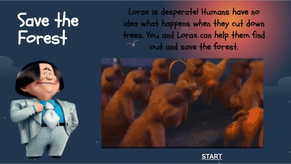 Lorax is desperate! Humans have no idea what happens when they cut down trees. You and Lorax can help them find out and save the forest.