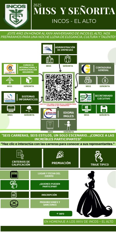 📅 Fecha: Miércoles 21 de mayo de 2025 🕕 Hora: Inmediatamente después de la elección ✨ GANADORAS: Serán elegidas DOS REPRESENTANTES: 🔹 MISS INCOS EL ALTO 2025 🔹 SEÑORITA INCOS EL ALTO 2025 🎊 ¡Celebra con nosotros este gran evento institucional! 🎊