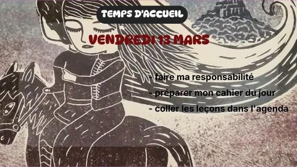 - faire ma responsabilité -sortir mon carnet de vocabulaire - préparer mon cahier du jour - colorier la page de présentation de mon cahier du jour