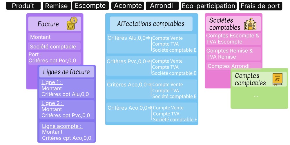 Pour chaque ligne de la facture, les critères comptables permettent de trouver les comptes comptables sur les affectations comptables !