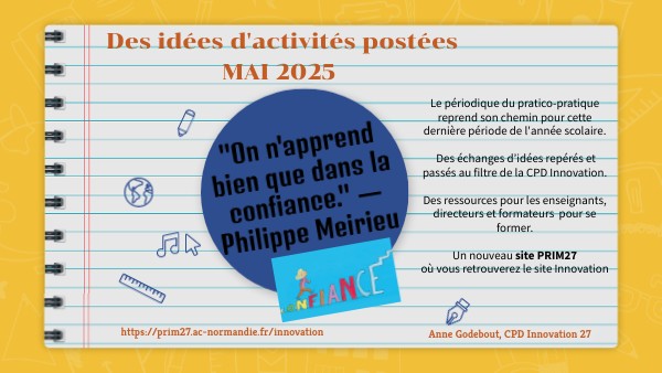Le périodique du pratico-pratique reprend son chemin pour cette dernière période de l'année scolaire. Des échanges d’idées repérés et passés au filtre de la CPD Innovation. Des ressources pour les enseignants, directeurs et formateurs pour se former. Un nouveau site PRIM27 où vous retrouverez le site Innovation