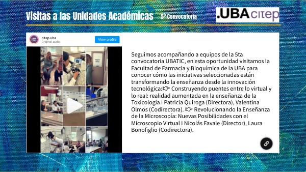 Seguimos acompañando a equipos de la 5ta convocatoria UBATIC, en esta oportunidad visitamos la Facultad de Farmacia y Bioquímica de la UBA para conocer cómo las iniciativas seleccionadas están transformando la enseñanza desde la innovación tecnológica:👉 Construyendo puentes entre lo virtual y lo real: realidad aumentada en la enseñanza de la Toxicología I Patricia Quiroga (Directora), Valentina Olmos (Codirectora). 👉 Revolucionando la Enseñanza de la Microscopía: Nuevas Posibilidades con el Microscopio Virtual I Nicolás Favale (Director), Laura Bonofiglio (Codirectora).