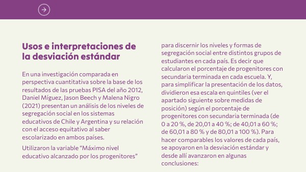 para discernir los niveles y formas de segregación social entre distintos grupos de estudiantes en cada país. Es decir que calcularon el porcentaje de progenitores con secundaria terminada en cada escuela. Y, para simplificar la presentación de los datos, dividieron esa escala en quintiles (ver el apartado siguiente sobre medidas de posición) según el porcentaje de progenitores con secundaria terminada (de 0 a 20 %, de 20,01 a 40 %; de 40,01 a 60 %; de 60,01 a 80 % y de 80,01 a 100 %). Para hacer comparables los valores de cada país, se apoyaron en la desviación estándar y desde allí avanzaron en algunas conclusiones:
