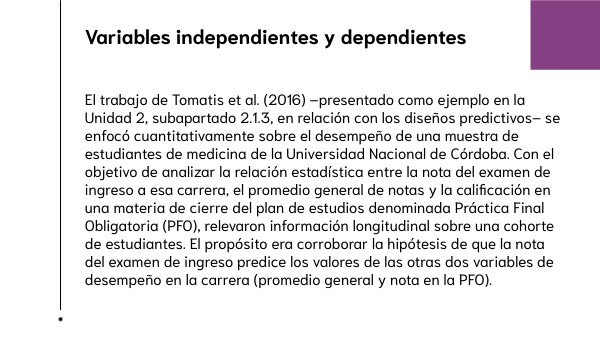 El trabajo de Tomatis et al. (2016) –presentado como ejemplo en la Unidad 2, subapartado 2.1.3, en relación con los diseños predictivos– se enfocó cuantitativamente sobre el desempeño de una muestra de estudiantes de medicina de la Universidad Nacional de Córdoba. Con el objetivo de analizar la relación estadística entre la nota del examen de ingreso a esa carrera, el promedio general de notas y la calificación en una materia de cierre del plan de estudios denominada Práctica Final Obligatoria (PFO), relevaron información longitudinal sobre una cohorte de estudiantes. El propósito era corroborar la hipótesis de que la nota del examen de ingreso predice los valores de las otras dos variables de desempeño en la carrera (promedio general y nota en la PFO).