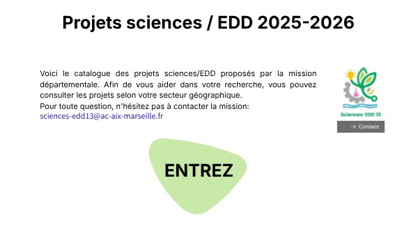 Voici le catalogue des projets sciences/EDD proposés par la mission départementale. Afin de vous aider dans votre recherche, vous pouvez consulter les projets selon votre secteur géographique. Pour toute question, n'hésitez pas à contacter la mission: