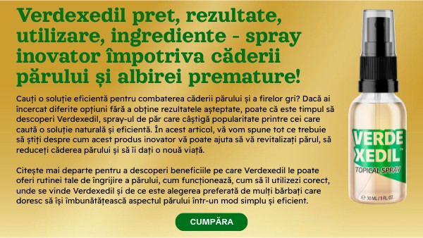 Cauți o soluție eficientă pentru combaterea căderii părului și a firelor gri? Dacă ai încercat diferite opțiuni fără a obține rezultatele așteptate, poate că este timpul să descoperi Verdexedil, spray-ul de păr care câștigă popularitate printre cei care caută o soluție naturală și eficientă. În acest articol, vă vom spune tot ce trebuie să știți despre cum acest produs inovator vă poate ajuta să vă revitalizați părul, să reduceți căderea părului și să îi dați o nouă viață. Citește mai departe pentru a descoperi beneficiile pe care Verdexedil le poate oferi rutinei tale de îngrijire a părului, cum funcționează, cum să îl utilizezi corect, unde se vinde Verdexedil și de ce este alegerea preferată de mulți bărbați care doresc să își îmbunătățească aspectul părului într-un mod simplu și eficient.