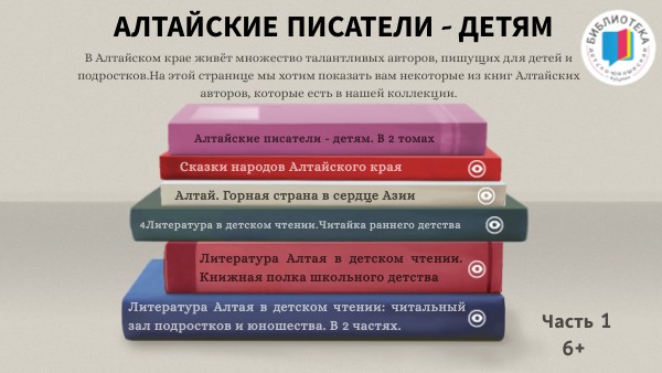 В Алтайском крае живёт множество талантливых авторов, пишущих для детей и подростков.На этой странице мы хотим показать вам некоторые из книг Алтайских авторов, которые есть в нашей коллекции.