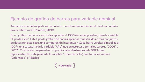 Tomamos uno de los gráficos de un informe sobre tendencias en el nivel secundario en el ámbito rural (Paredes, 2018). Es un gráfico de barras verticales apiladas al 100 % (o superpuestas) para la variable “Tipo de ciclo”. Este tipo de gráfico de barras apiladas muestra dos o más conjuntos de datos (en este caso, una comparación interanual). Cada barra vertical simboliza al 100 % una categoría de la variable “Año”, que en este caso toma los valores “2006” y “2017”. Y se dividen segmentos proporcionales dentro de cada 100 % que representan las categorías de la variable “Tipos de ciclo”, que toma los valores “Orientado” o “Básico”.