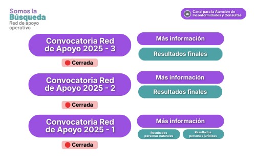 En el marco del proceso de convocatoria Nacional Red de Apoyo Operativo para la Búsqueda, informamos que cualquier inconformidad, observación o consulta relacionada con los resultados o el desarrollo del proceso deberá ser presentada a través del siguiente correo electrónico institucional: servicioalciudadano@unidadbusqueda.gov.co Se invita a los interesados a formular sus comunicaciones de manera clara, respetuosa y sustentada, indicando nombre completo, número de documento de identidad o NIT (según aplique), y los datos de contacto para recibir respuesta oportuna.Las solicitudes recibidas serán atendidas en los plazos establecidos conforme a lo previsto en la normativa vigente.