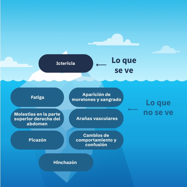 En casos más graves de MASH con cirrosis (cicatrización severa) del hígado, la piel y los ojos pueden adquirir un tono amarillento (ictericia). La ictericia es un signo de daño hepático grave.