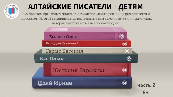 В Алтайском крае живёт множество талантливых авторов, пишущих для детей и подростков. На этой странице мы хотим показать вам некоторые из книг Алтайских авторов, которые есть в нашей коллекции.